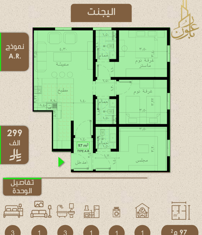 شقة ثلاث غرف بمساحة 95م و 97م تحت الانشاء